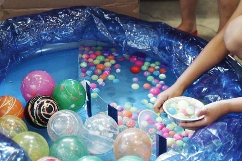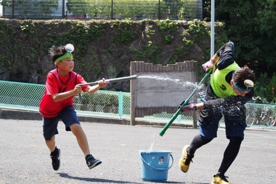 塩ビパイプで作った飛距離抜群の水鉄砲をつかったウォーターバトル。普段はなかなかできない大規模な水鉄砲遊びも、峰山ならできちゃいます!