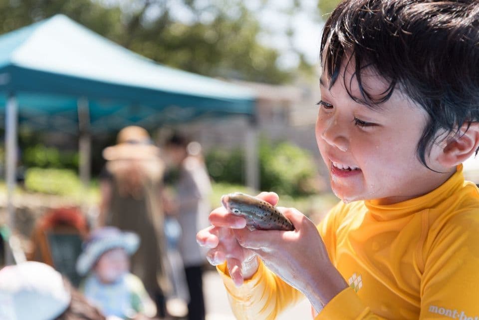 こわがっているのは最初だけ、誰もが夢中になってお魚を追い回します。捕まえたあまごは、塩焼きにして美味しくいただきます!